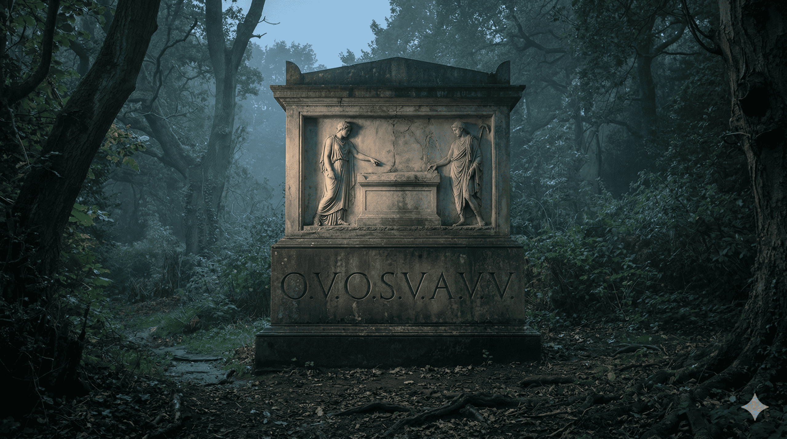 Stelle dir vor, du stehst in der dämmerigen Stille eines verwunschenen englischen Gartens. Vor dir ragt ein massives, graues Steinmonument auf, das fast wie ein Portal in eine andere Welt wirkt. Die Luft ist kühl und riecht nach feuchter Erde und altem Gestein. Dein Blick fällt auf ein kunstvolles Relief, das zwei Hirten zeigt, die an einem Grabmal stehen – eine Szene, die Ruhe ausstrahlt, doch unter dem Bild geschieht etwas Seltsames. Dort, in den harten Stein gemeißelt, prangt eine Zeichenfolge, die so deplatziert wirkt wie ein Schrei in einer Bibliothek: O.U.O.S.V.A.V.V. Eingerahmt von zwei weiteren Buchstaben auf einer tieferen Ebene, D. und M.